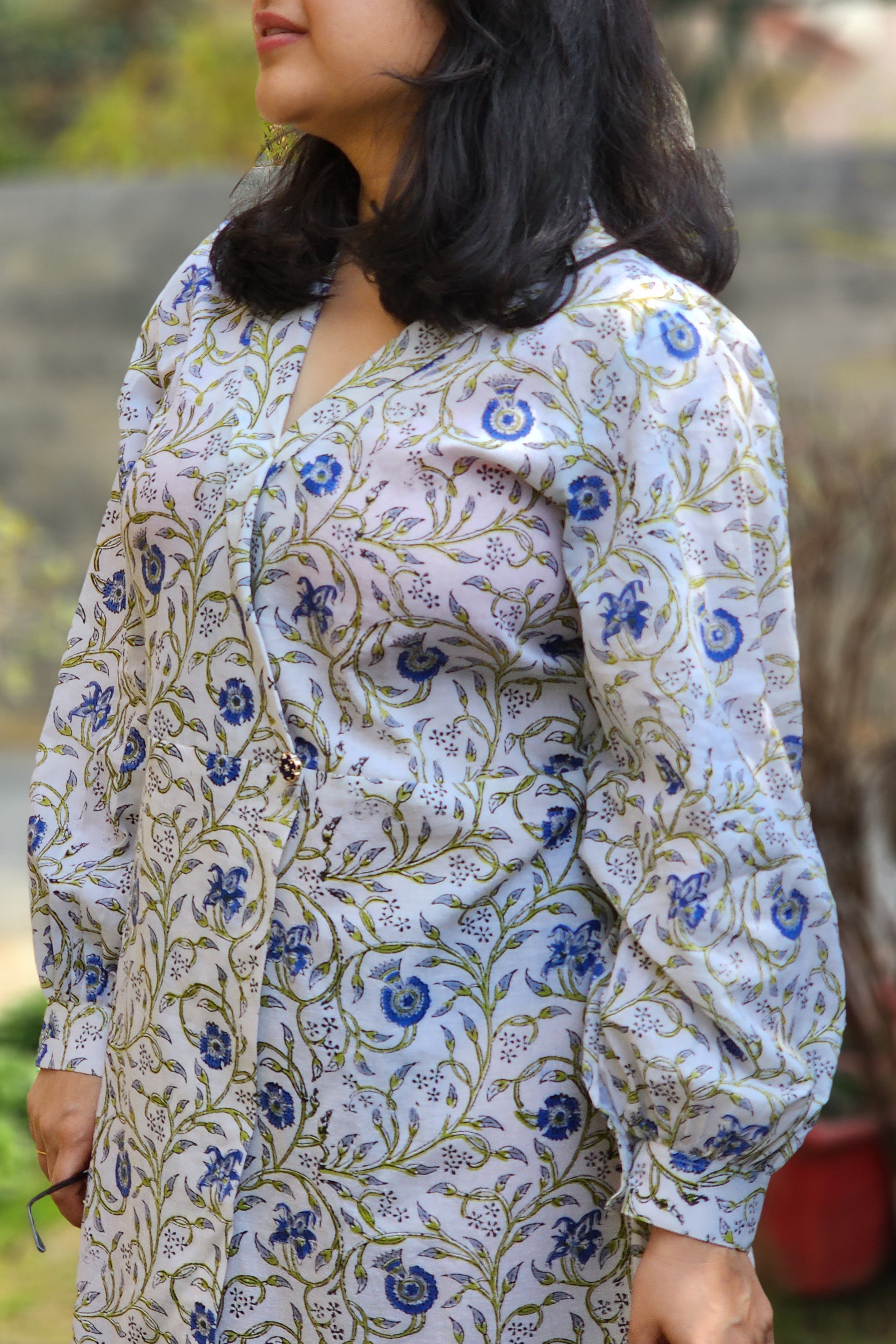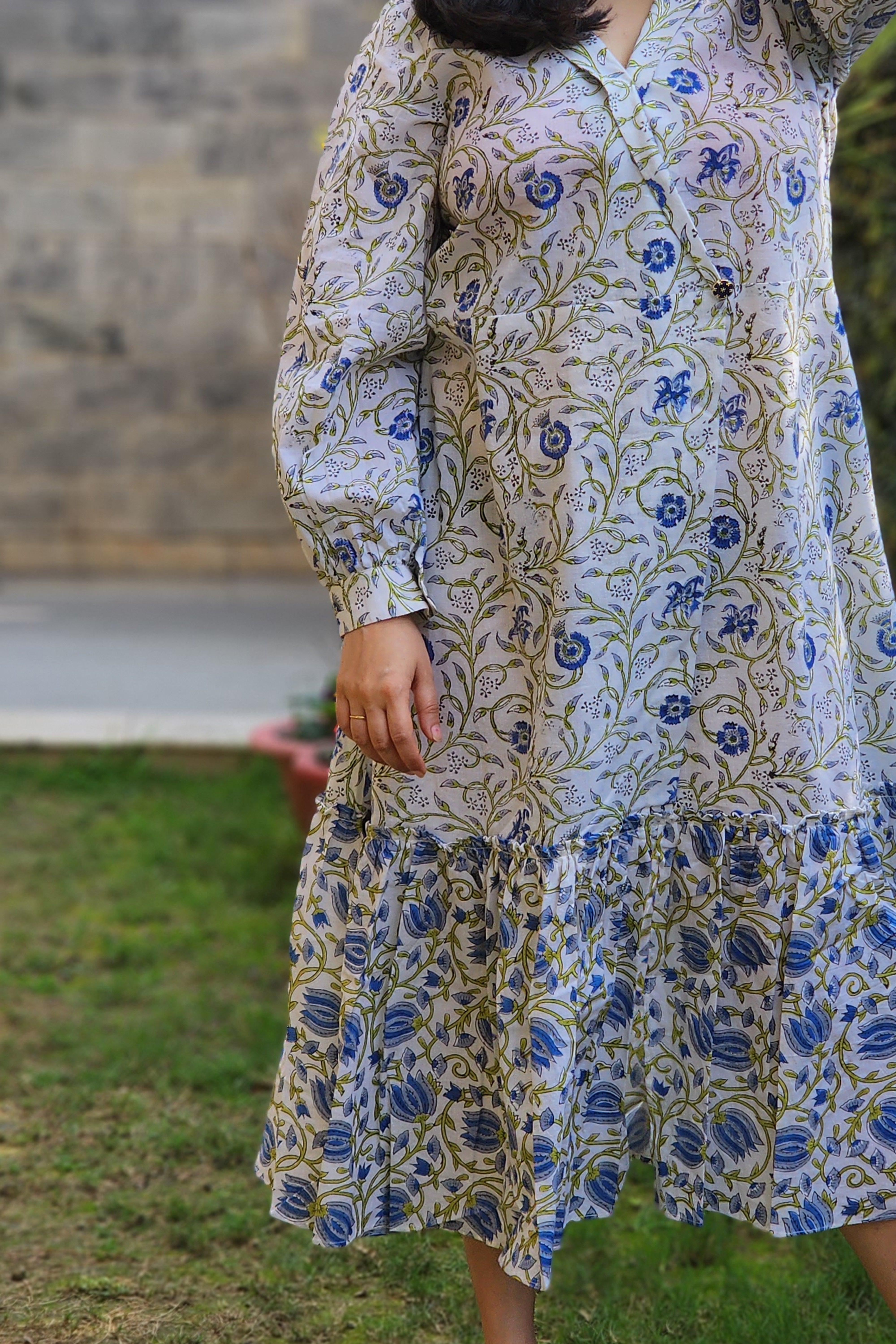 Introducing our Blossom Breeze Full-Length Floral Dress, a stunning ensemble that embodies timeless elegance and feminine charm. Crafted with meticulous attention to detail, this dress features a captivating blue and green floral print on a crisp white base, evoking the beauty of a spring garden in full bloom.