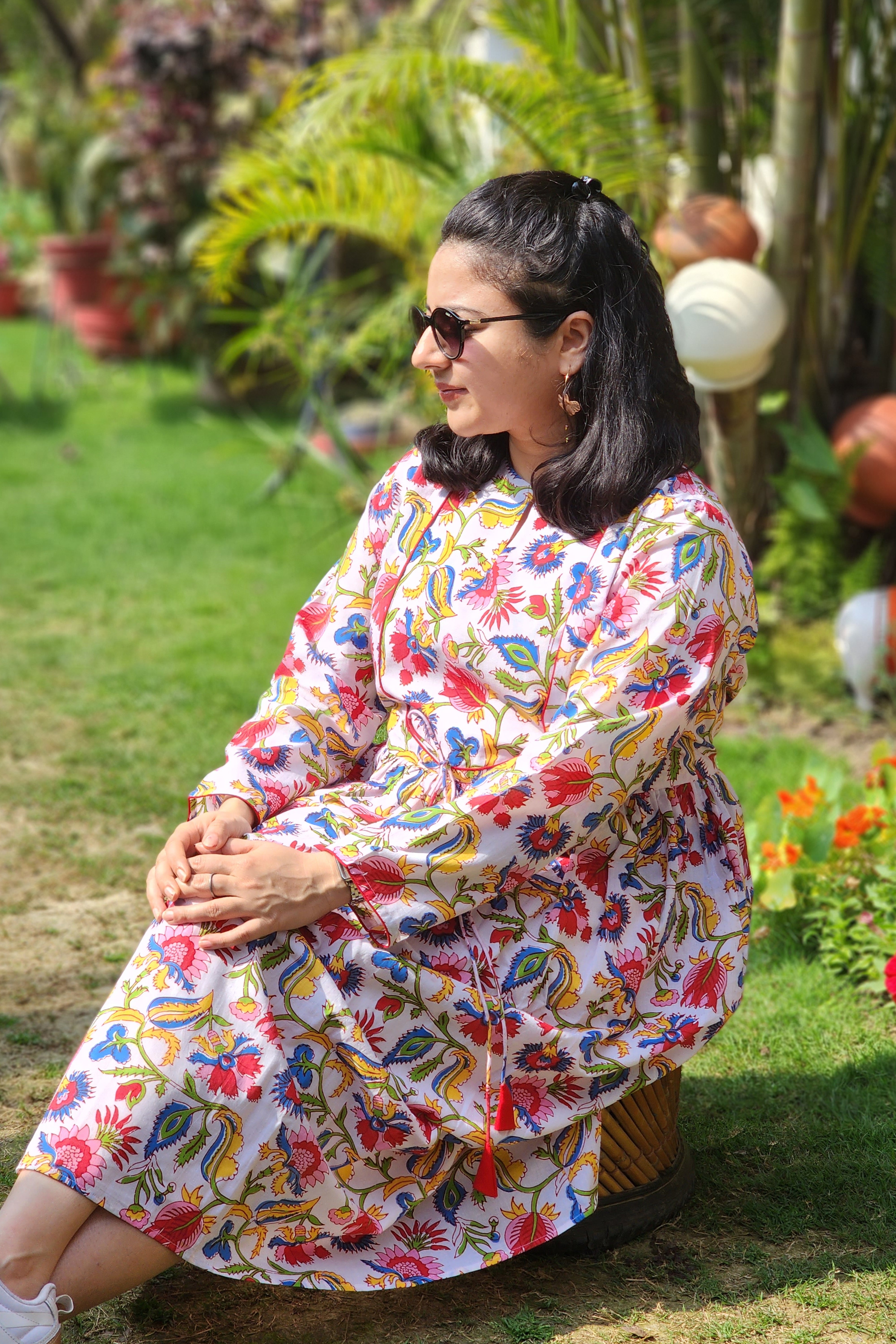 Introducing our Enchanting Meadow Floral Dress, a whimsical celebration of vibrant blooms and timeless elegance. Crafted from a pristine white base adorned with a kaleidoscope of multicolored floral prints, this dress is a vision of summertime bliss. With its full-length silhouette and flair from the yoke, it exudes an air of graceful movement and effortless charm.