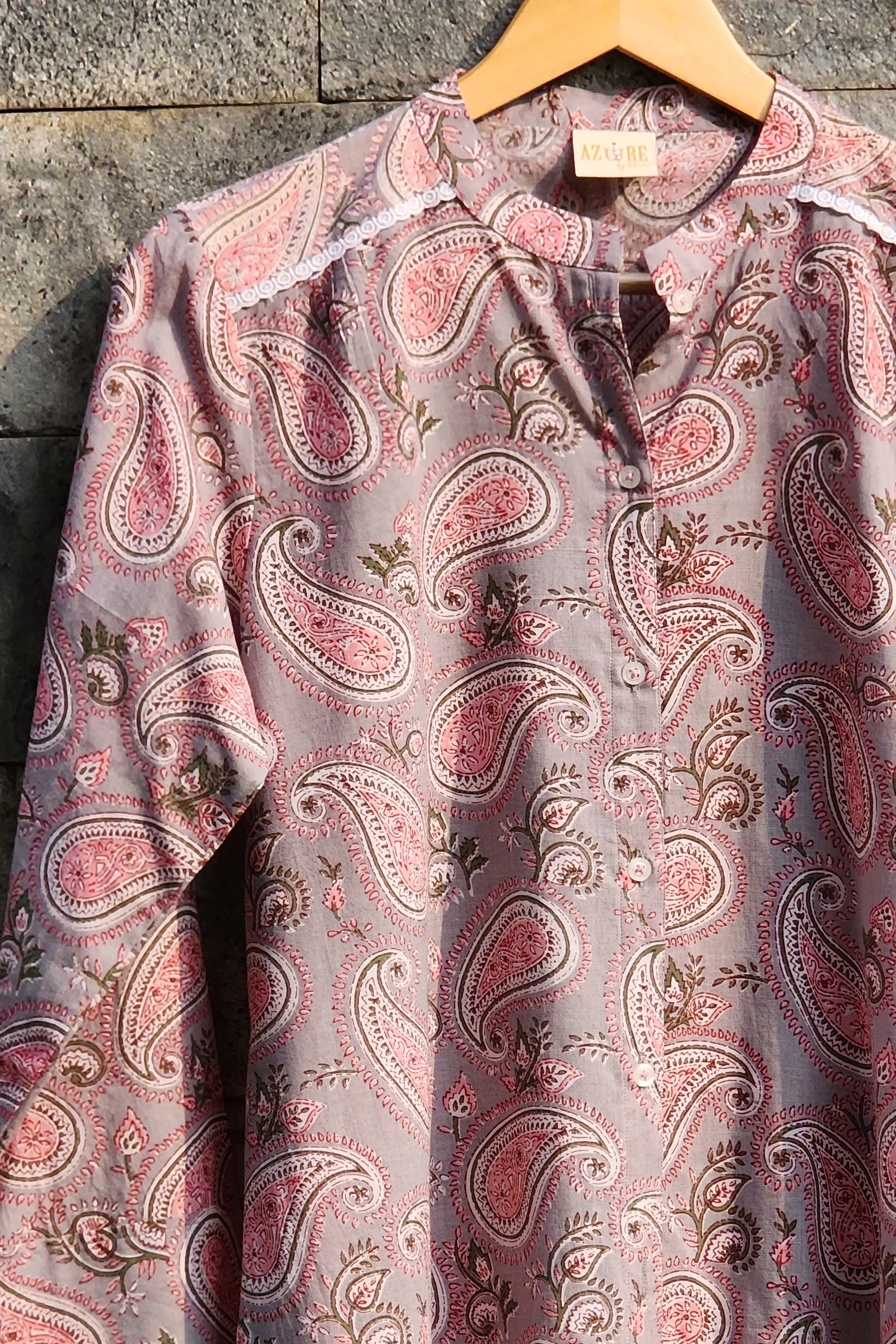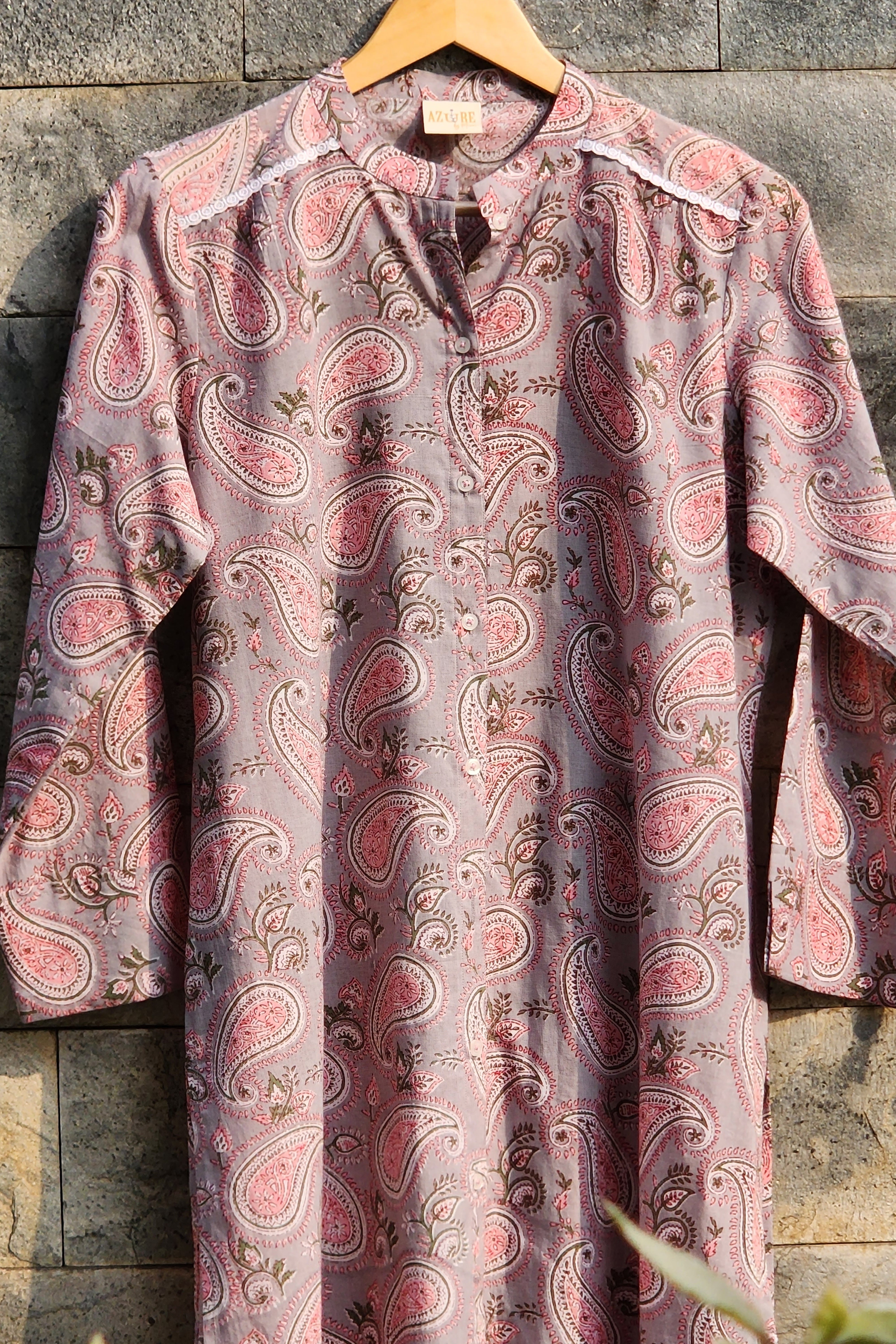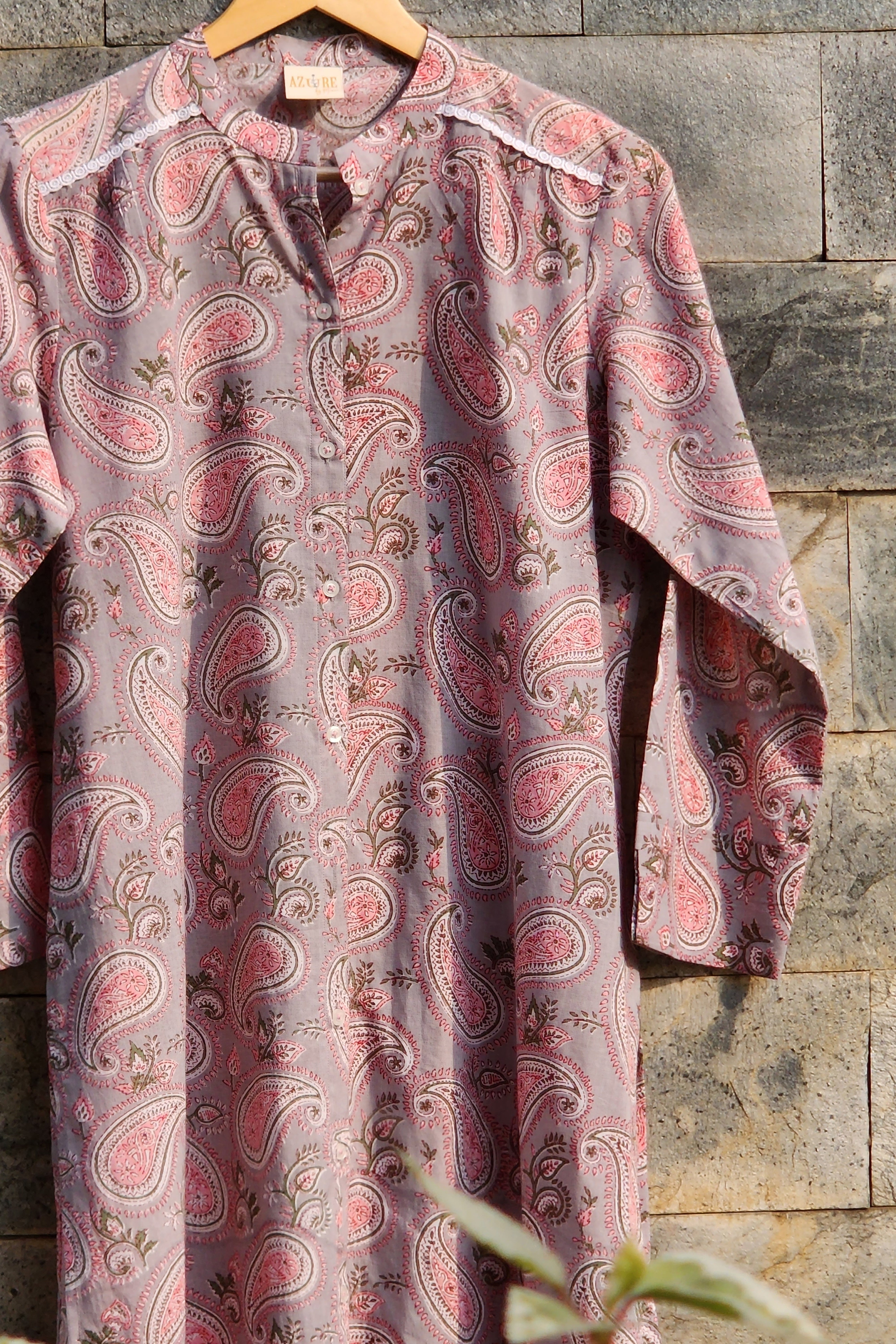 Introducing our Graceful Ambi Charm Mandarin Collar Shirt Dress, a timeless blend of traditional motifs and contemporary elegance. Crafted with meticulous attention to detail, this dress features a sophisticated mandarin collar and a grey base adorned with intricate pink, green, and white Ambi motif prints, celebrating the rich cultural heritage of India.