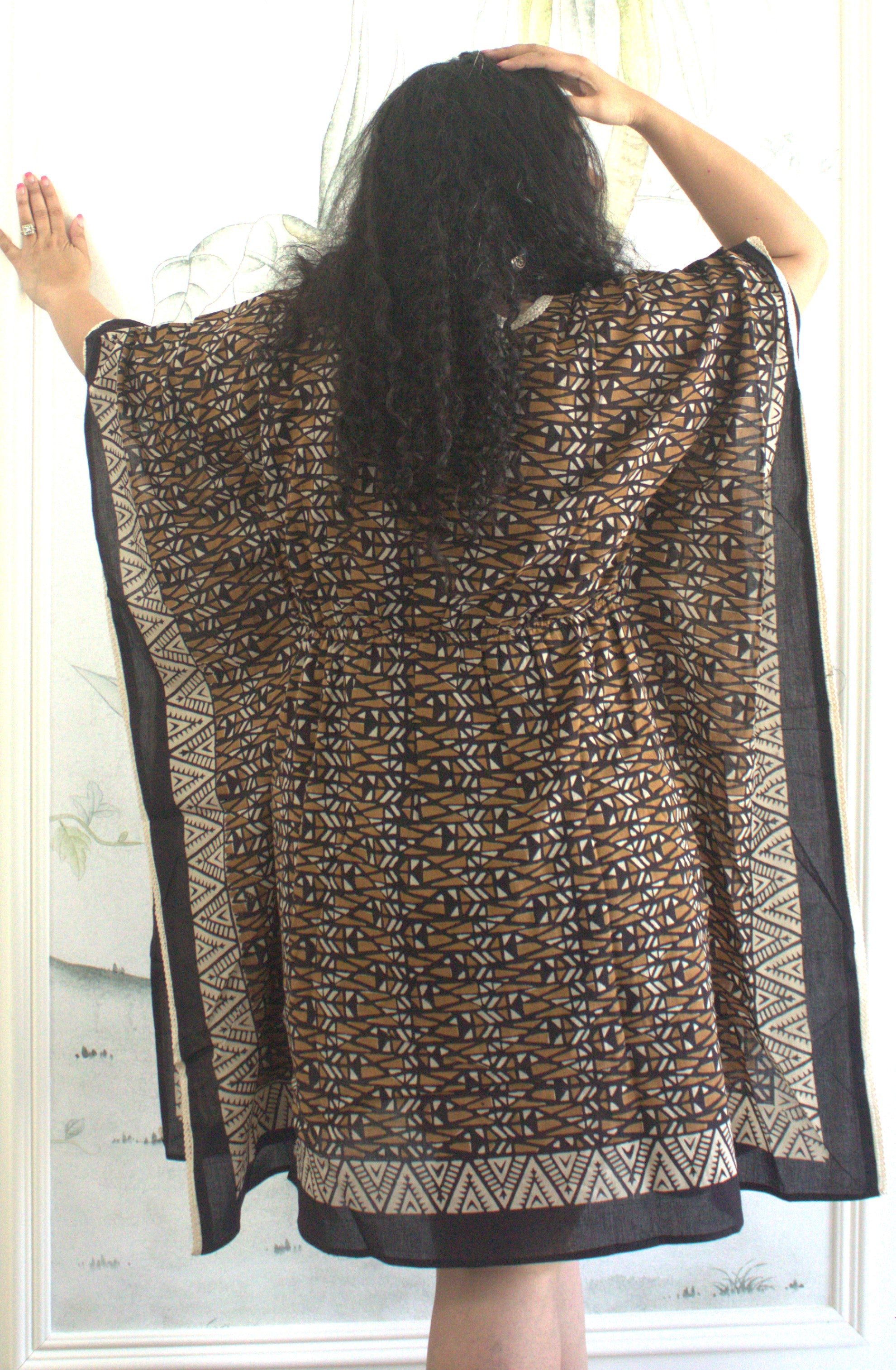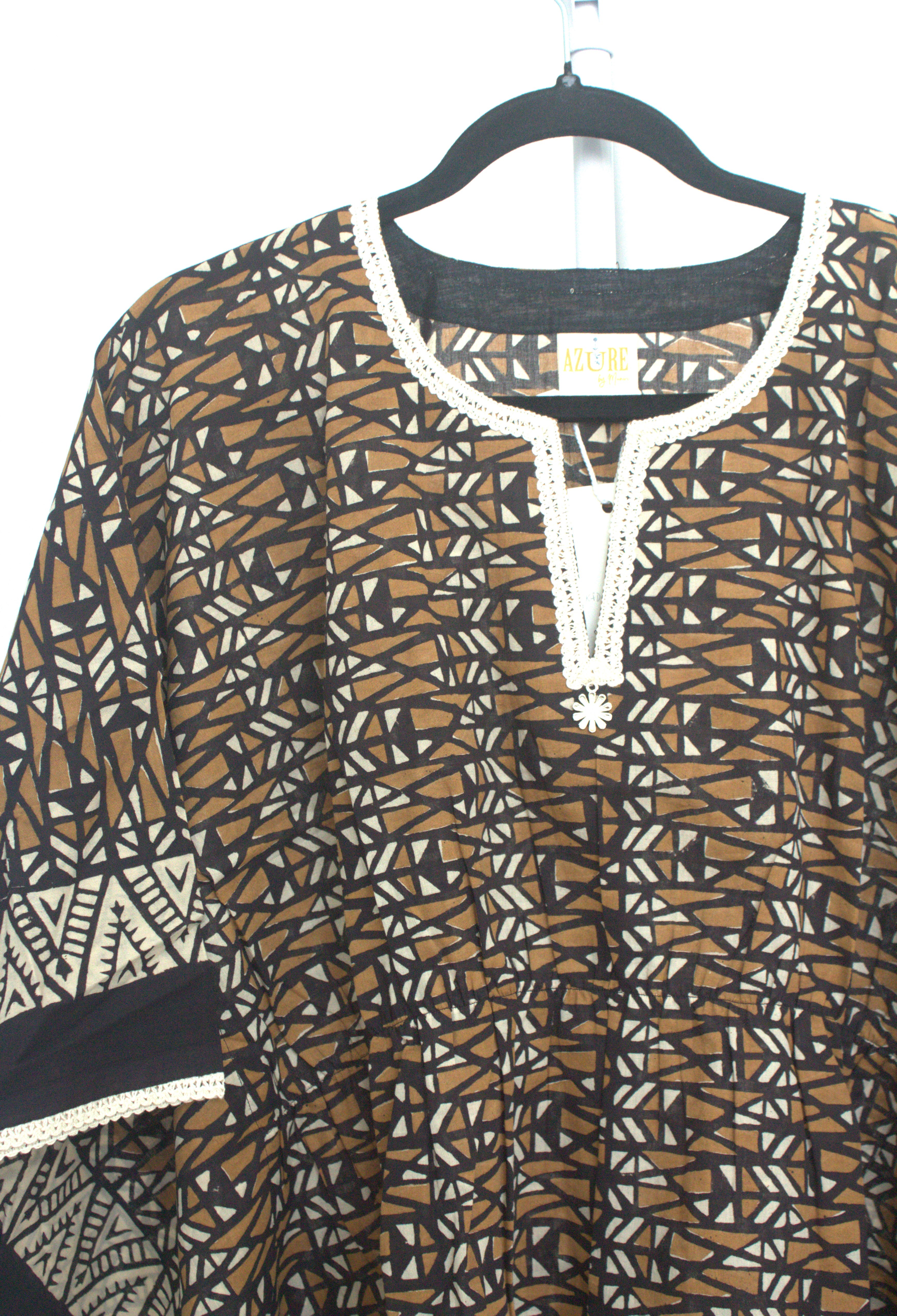 Dive into a world of effortless elegance with our collection of short geometric kaftans crafted from premium organic cotton. Embrace the freedom of one-size-fits-all comfort, designed to grace every silhouette with ease. Whether you're strolling along the shore or lounging by the poolside, our versatile pieces effortlessly transition from beachwear to chic summer attire. Adorned with vibrant prints, each dress doubles as a beach cover-up, adding a touch of whimsy to your seaside adventures. Explore our curated selection and discover the epitome of laid-back luxury for the sun-drenched days ahead.