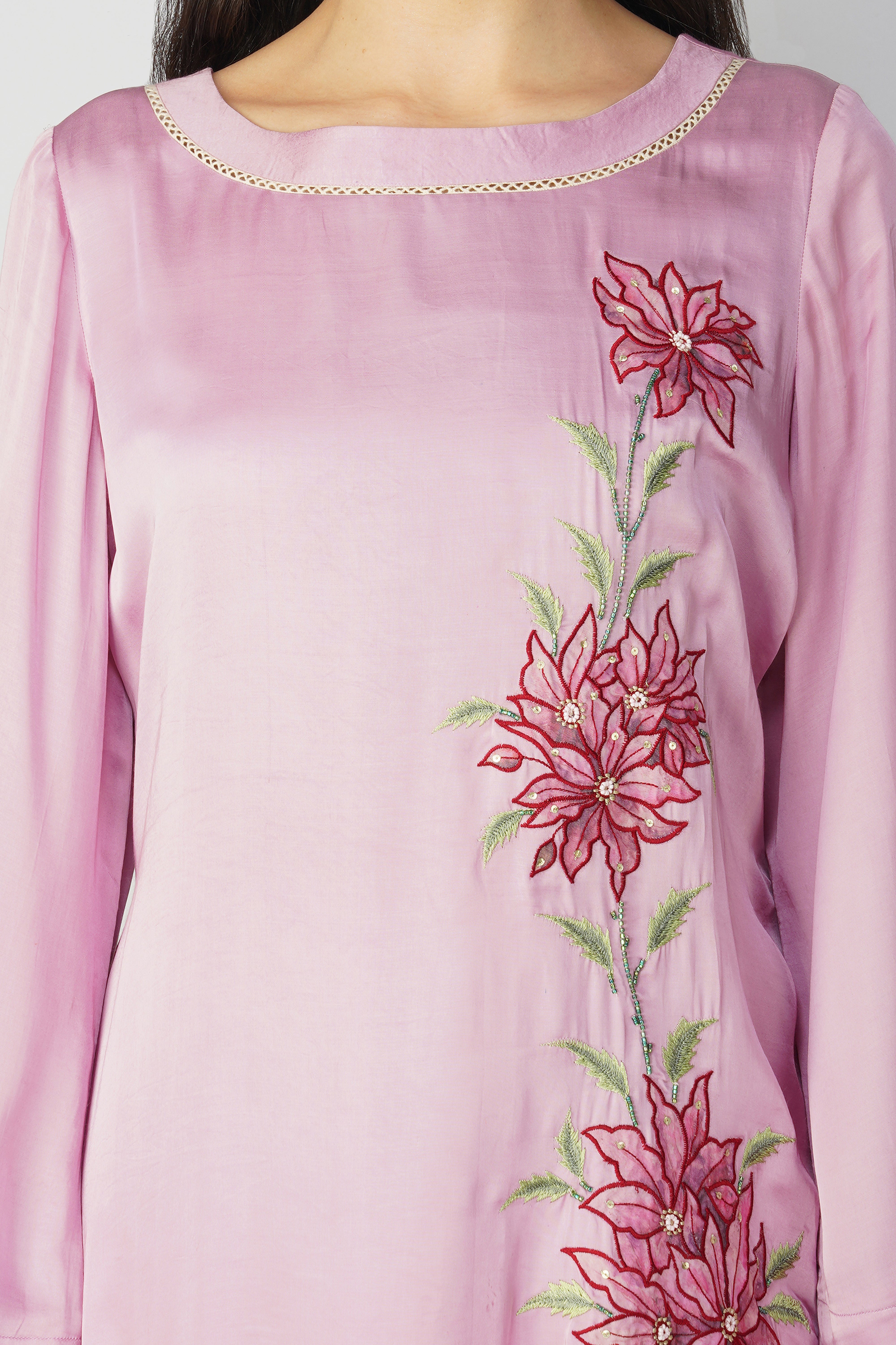 Embrace effortless elegance with our Lilac Blossom Modal Satin A-line Kurta Set. This enchanting ensemble features a delightful lilac hue and intricate floral appliqué, making it the perfect choice for any occasion from day to evening. Paired with straight cream pants, this set exudes a smart yet light festive vibe, offering a chic and versatile addition to your wardrobe.