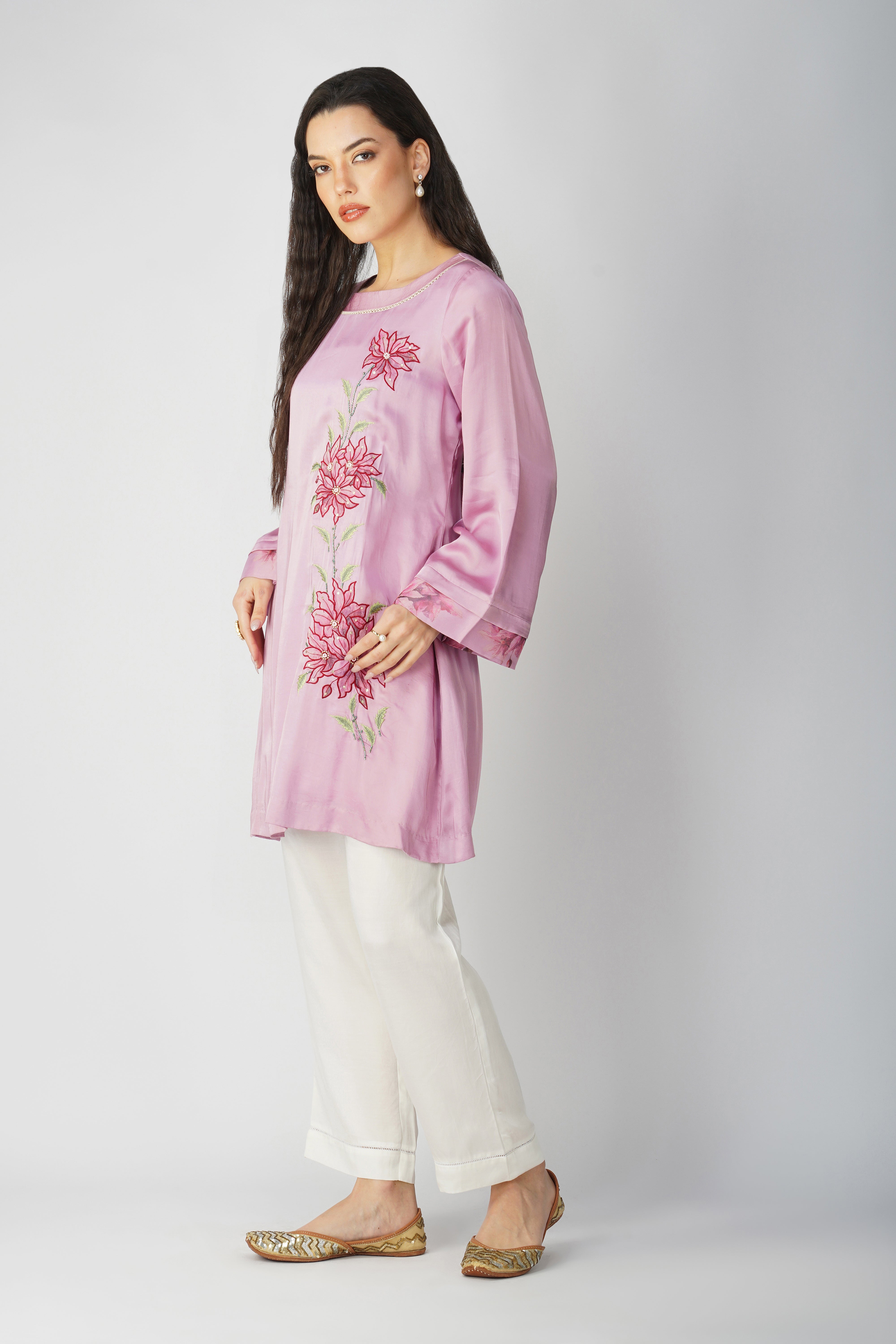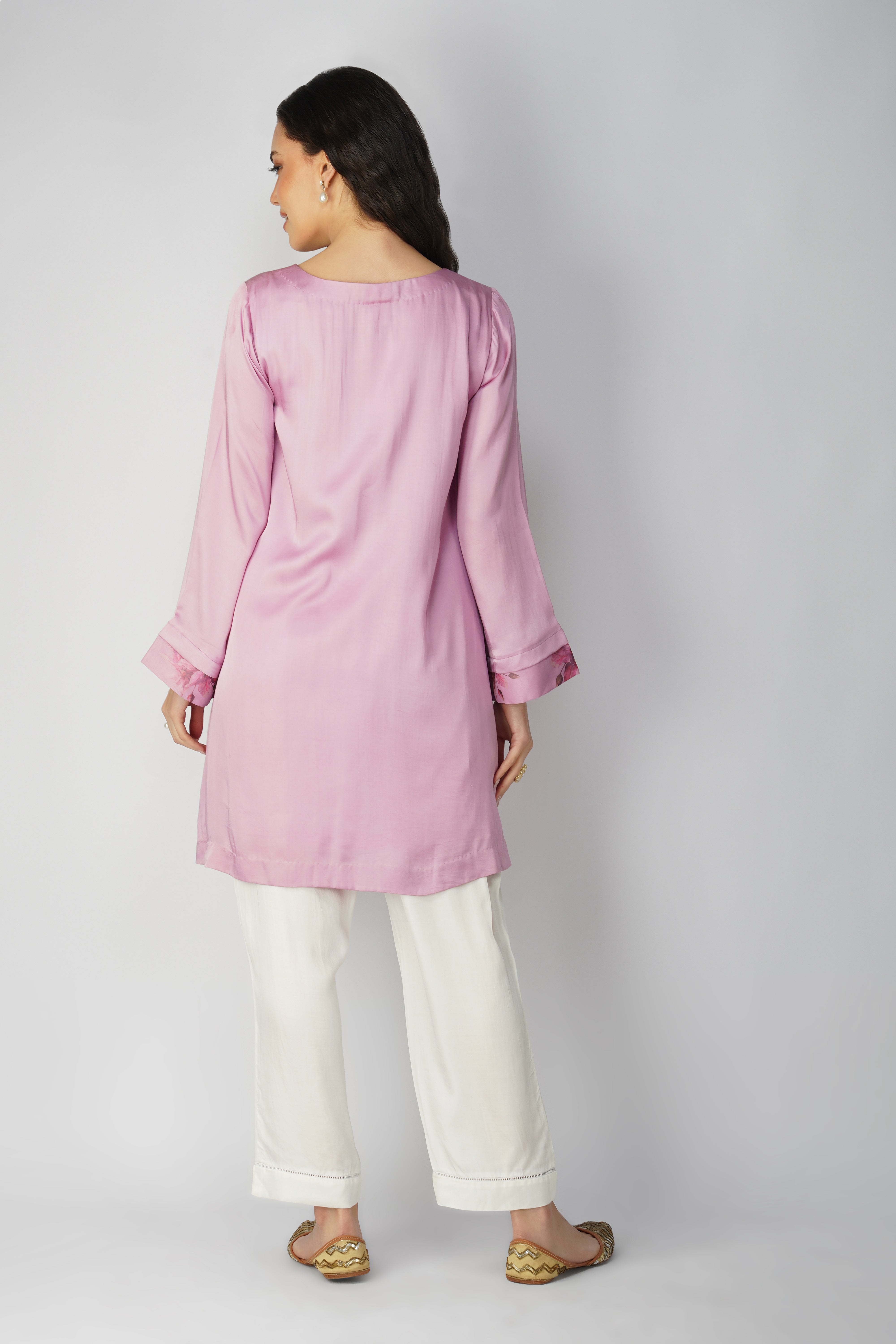 Lilac Modal Satin Kurta: Crafted from luxurious modal satin in a soft lilac shade, the A-line short kurta offers a breezy and comfortable fit, perfect for all-day wear.