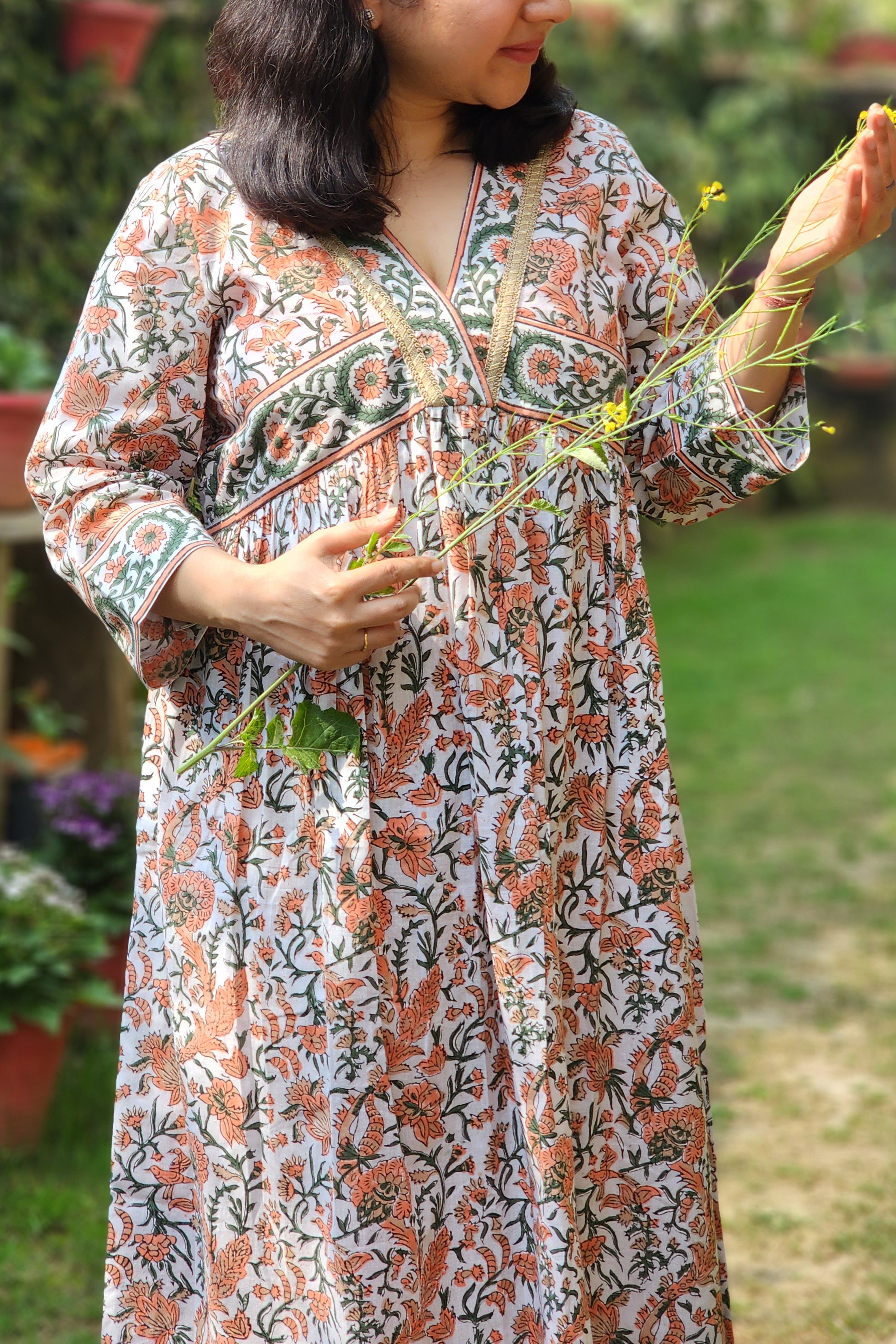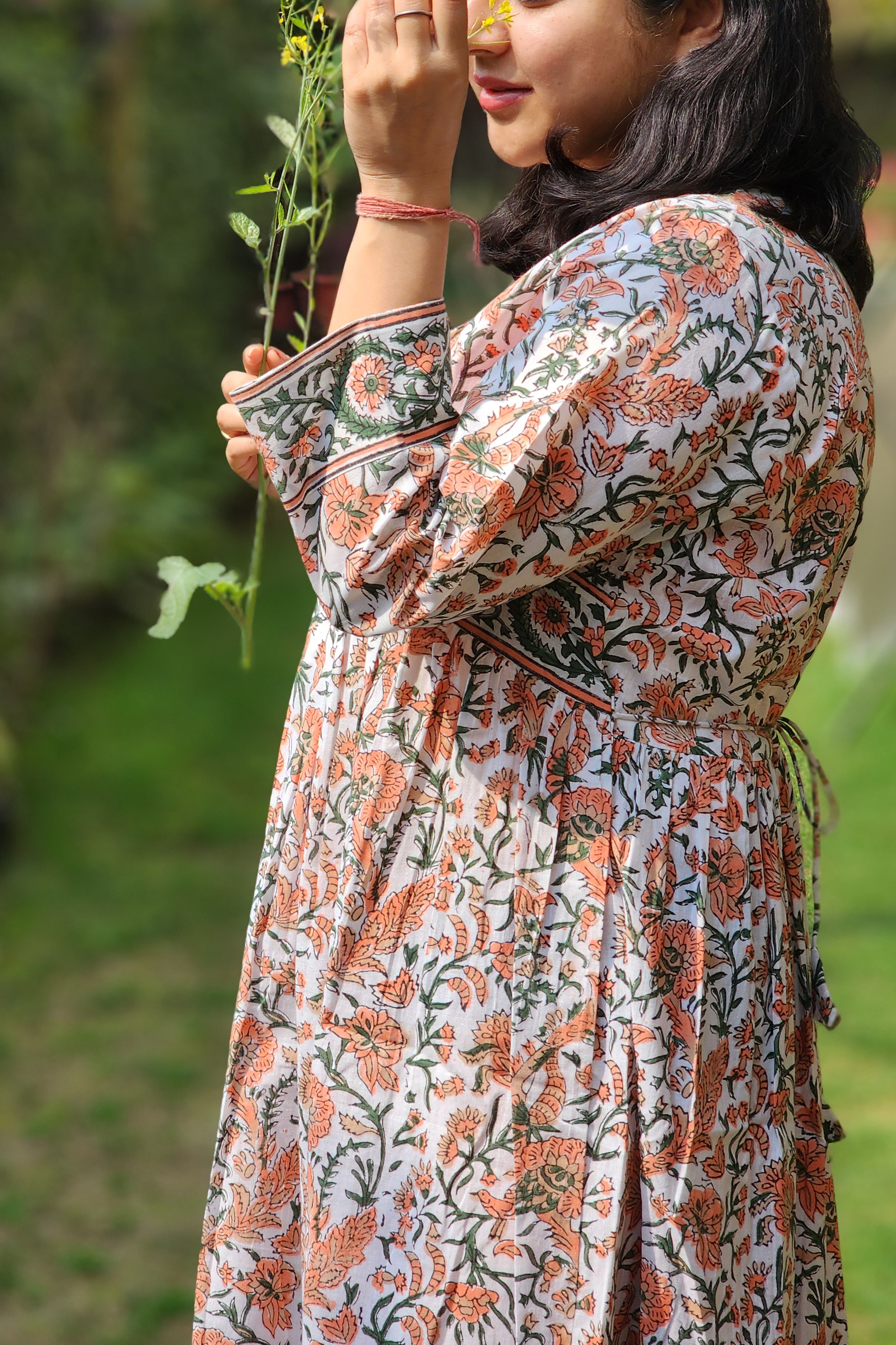 Marigold-Inspired Floral Print: Adorned with a whimsical floral print reminiscent of marigold blooms, this dress captures the essence of a blooming meadow on a bright summer day. The vibrant hues of orange and green add a pop of color to your wardrobe, while the delicate floral motifs evoke a sense of natural beauty and botanical charm.
