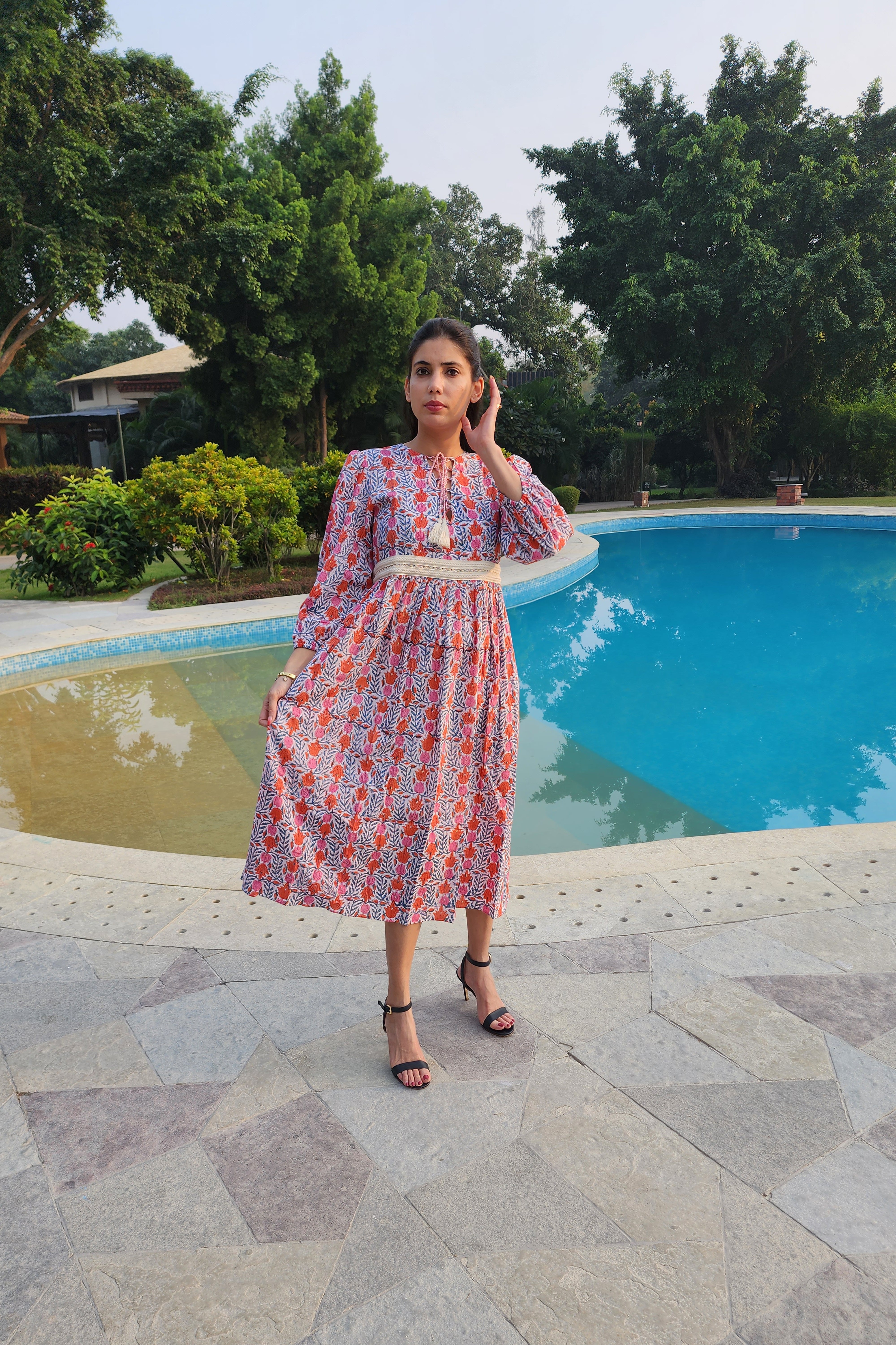 Care Instructions: To maintain the beauty and longevity of your dress, we recommend hand washing in cold water and air drying. Avoid bleach and tumble drying to preserve the quality of the fabric and the vibrancy of the print and lace detailing.