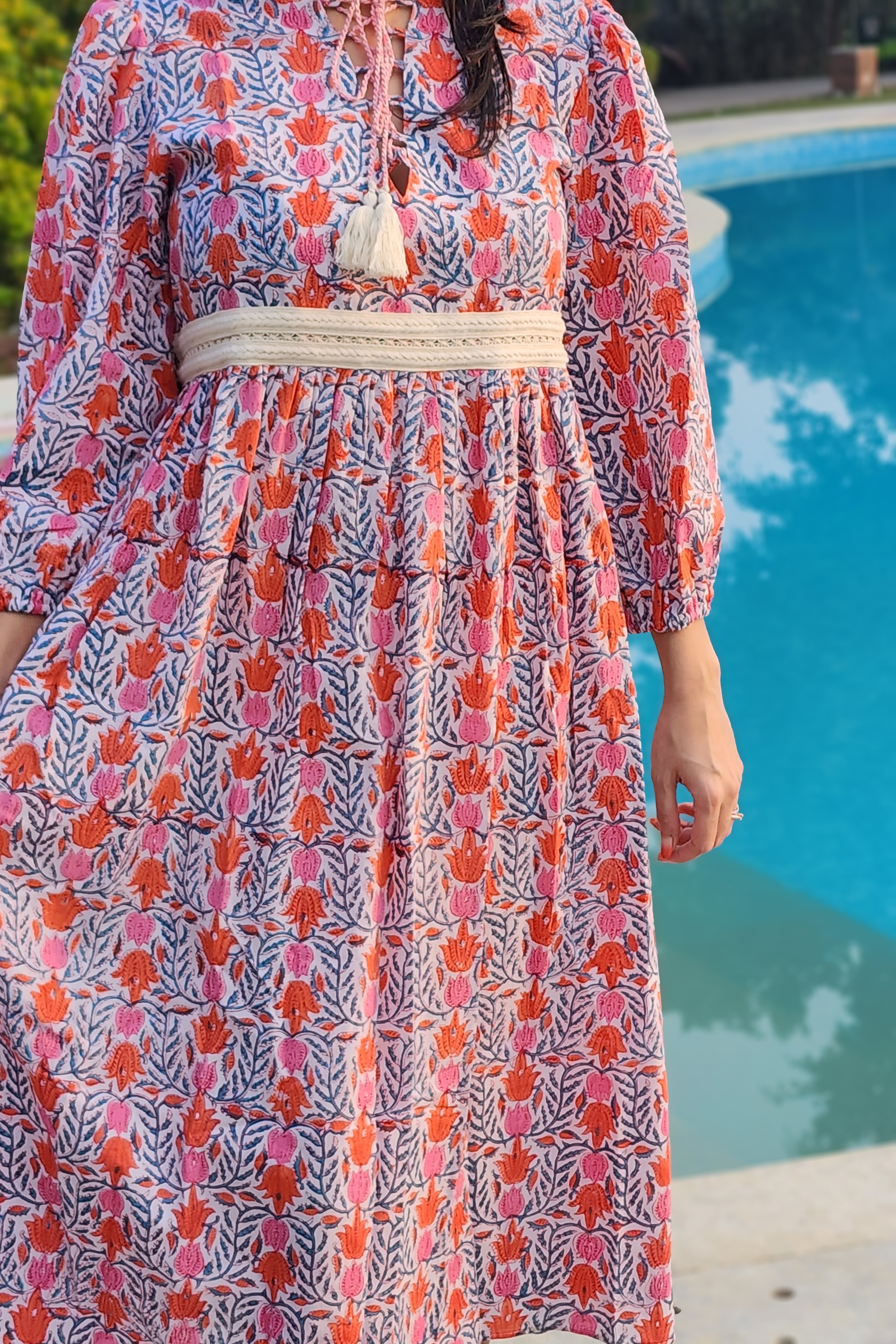 3. Tie with Tassel Details: Adding a playful and bohemian touch, the dress features a tie with tassel details at the neckline. These whimsical accents draw the eye and infuse the ensemble with a sense of carefree charm and playful elegance.