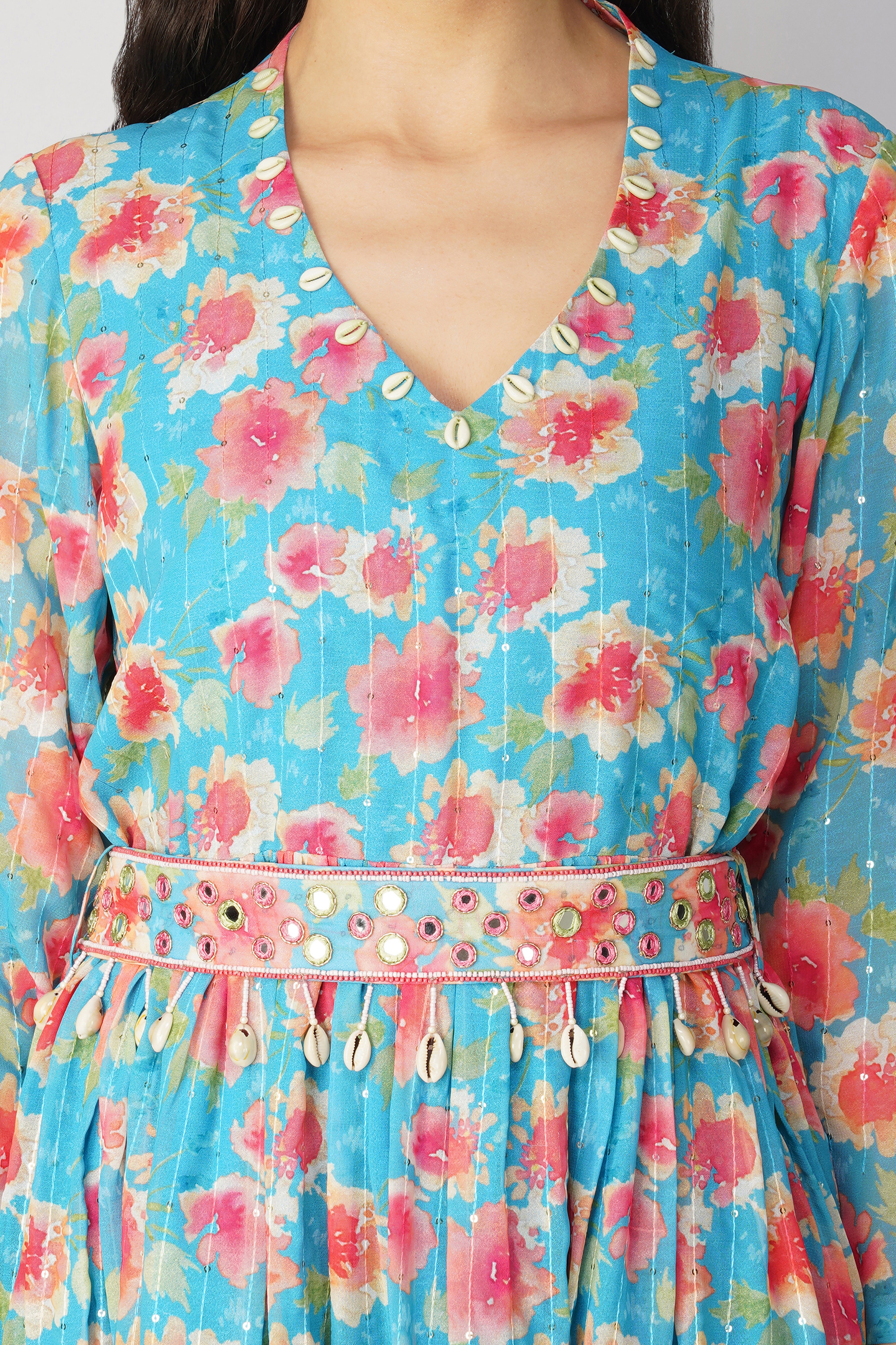 Watercolor Floral Print: The light blue base comes alive with the ethereal charm of watercolor flowers. The delicate print adds a touch of whimsy to the dress, making it a captivating choice for your special moments.