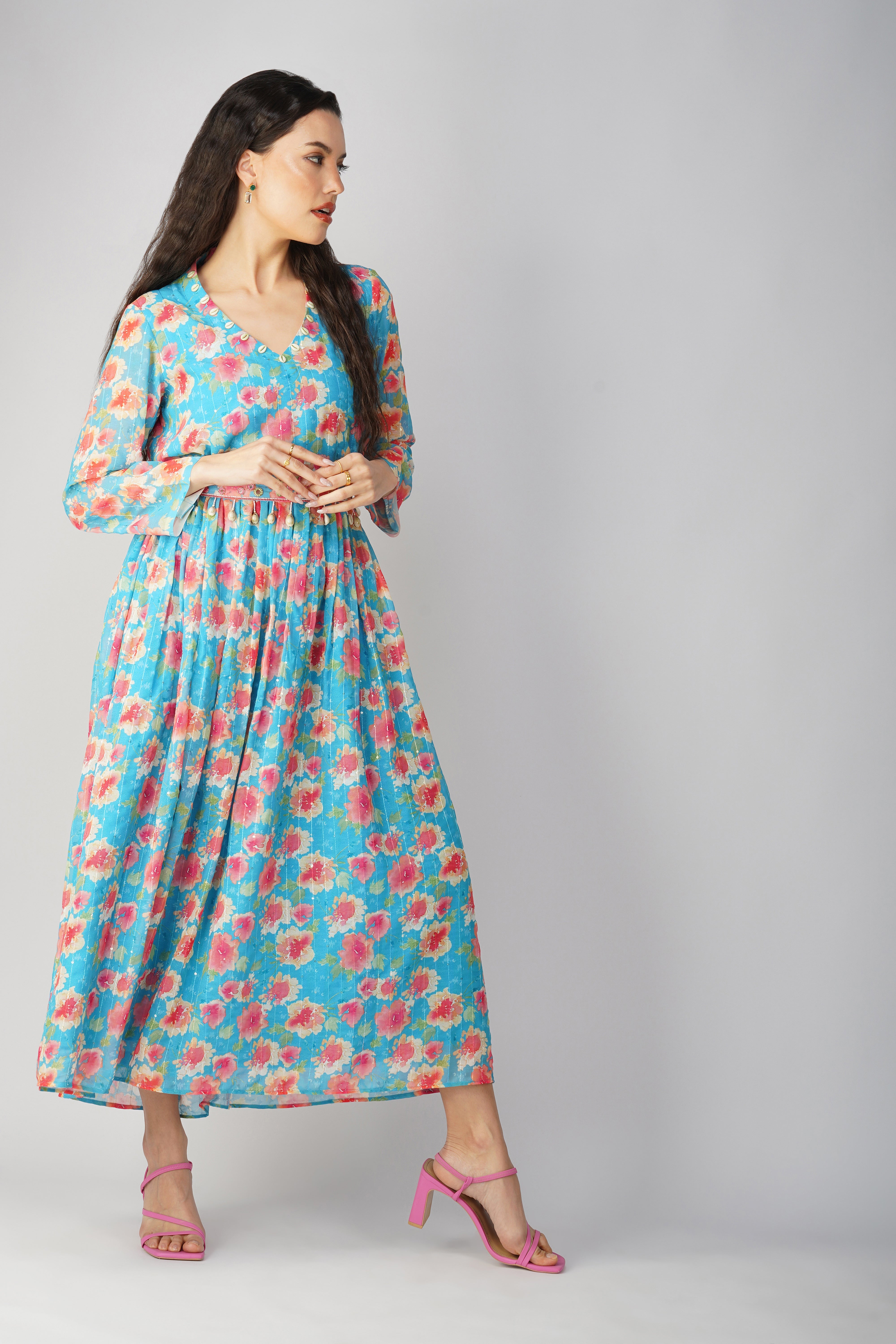 Elevate your special occasions with our Serene Blossom Georgette Gathered Dress – a vision of grace and sophistication. This floor-length dress boasts an enchanting light blue print adorned with watercolor flowers, creating a harmonious blend of elegance and artistic flair.