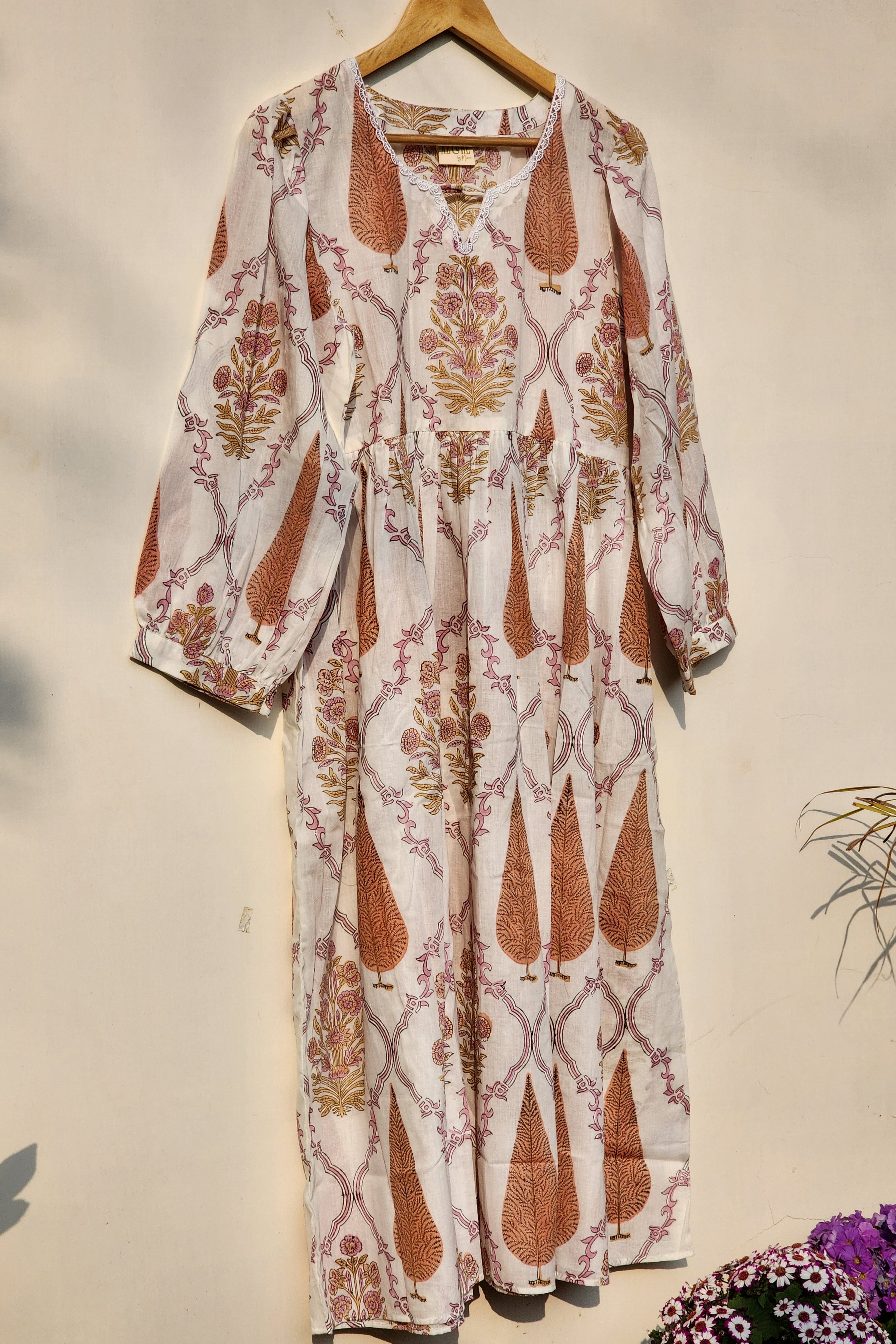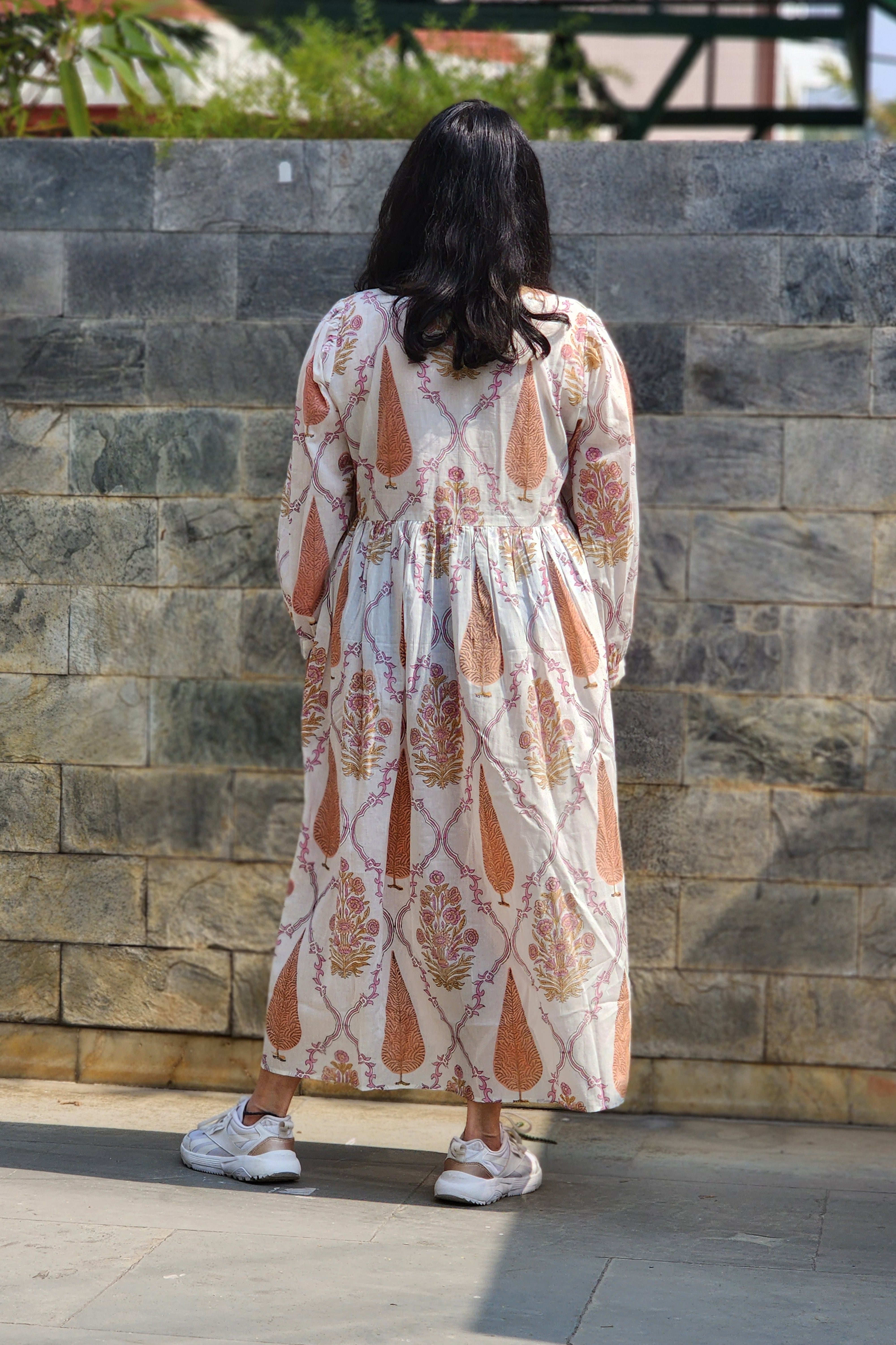 Introducing our Summer Breeze Tree and Leaf Motif Dress, a delightful fusion of nature-inspired charm and breezy elegance. Crafted from lightweight cotton fabric, this calf-length dress is perfect for warm days and sunny adventures. The dress features a timeless white base adorned with a whimsical tree and leaf motif print in vibrant shades of orange, green, and brown, evoking the beauty of a lush forest in full bloom.
