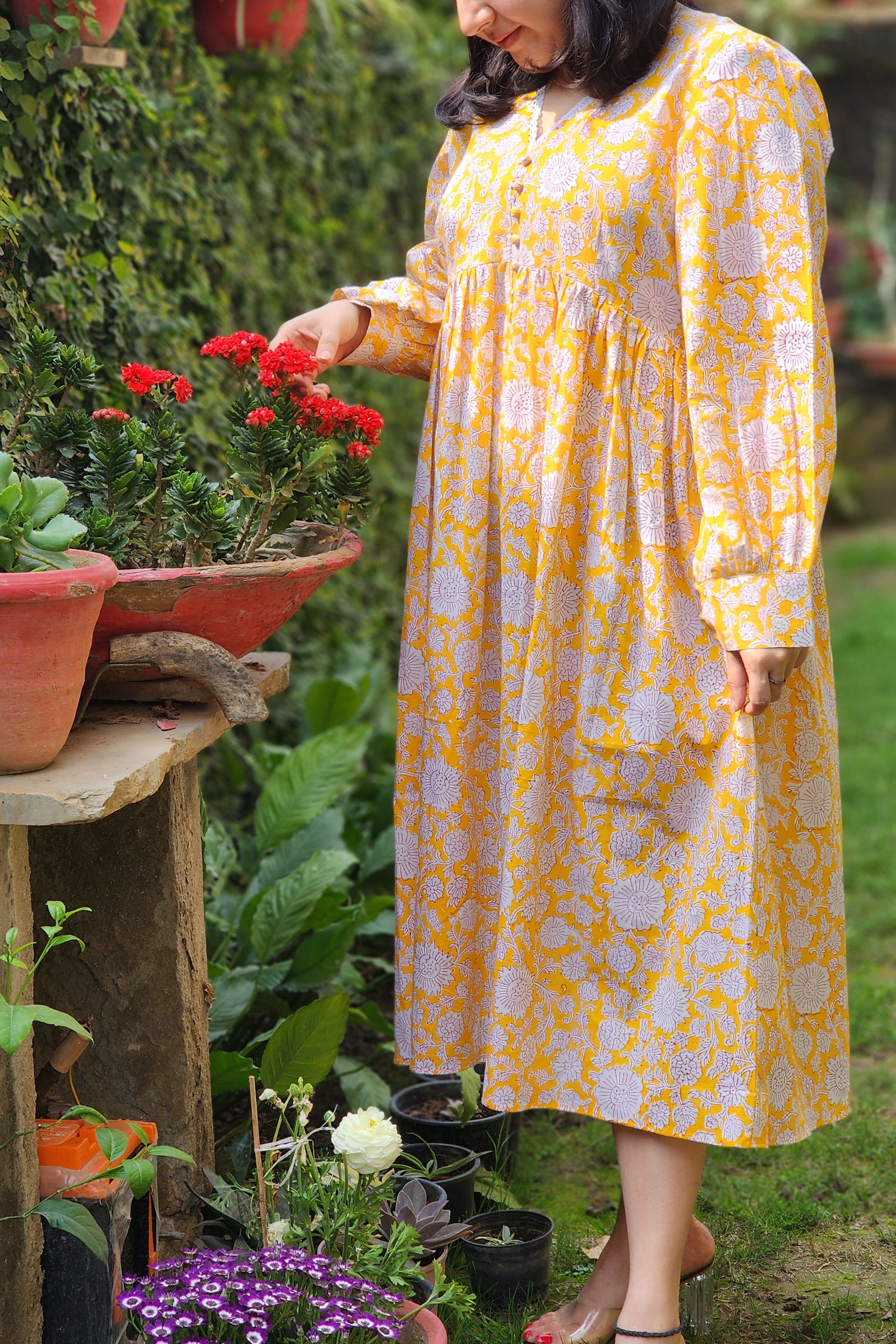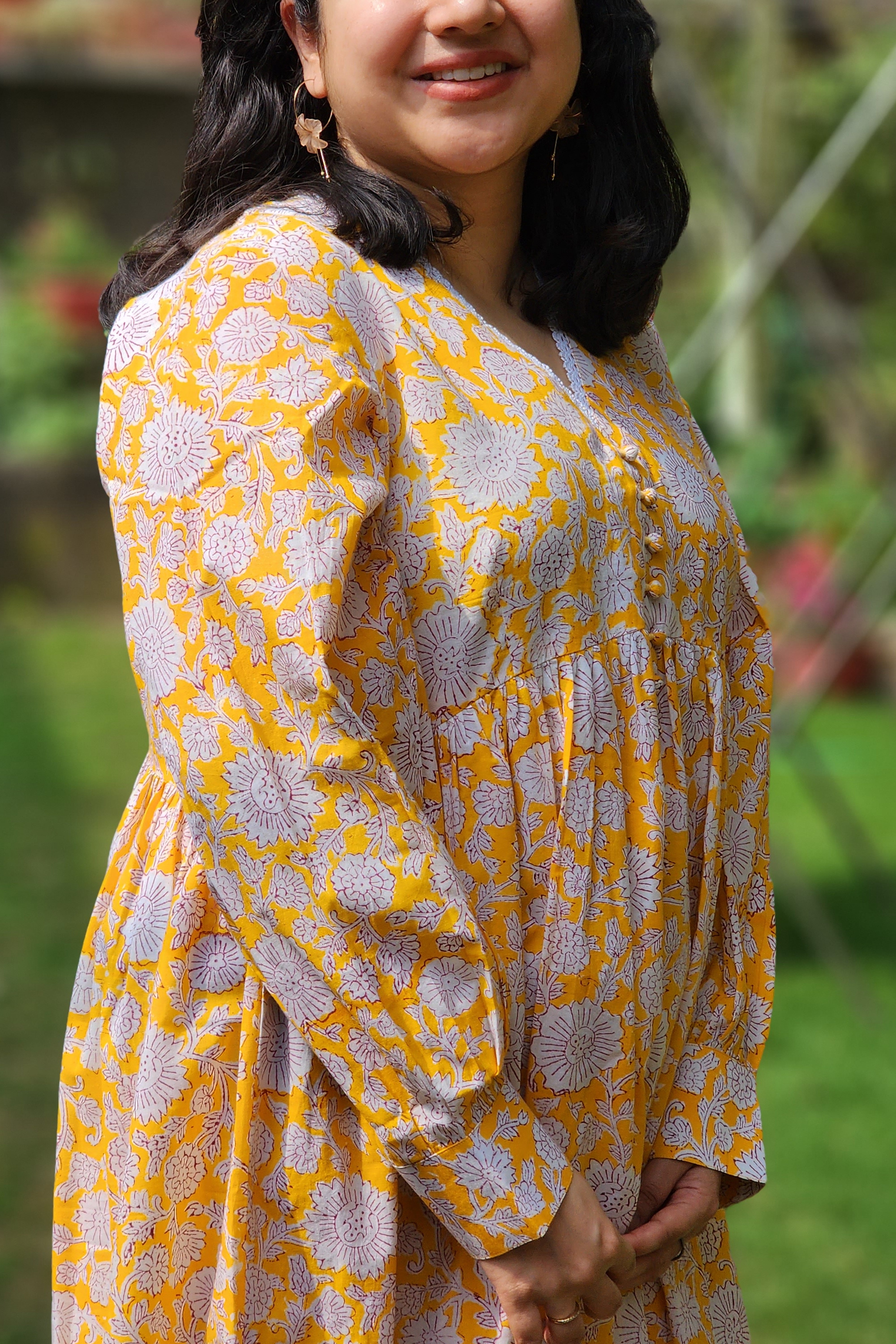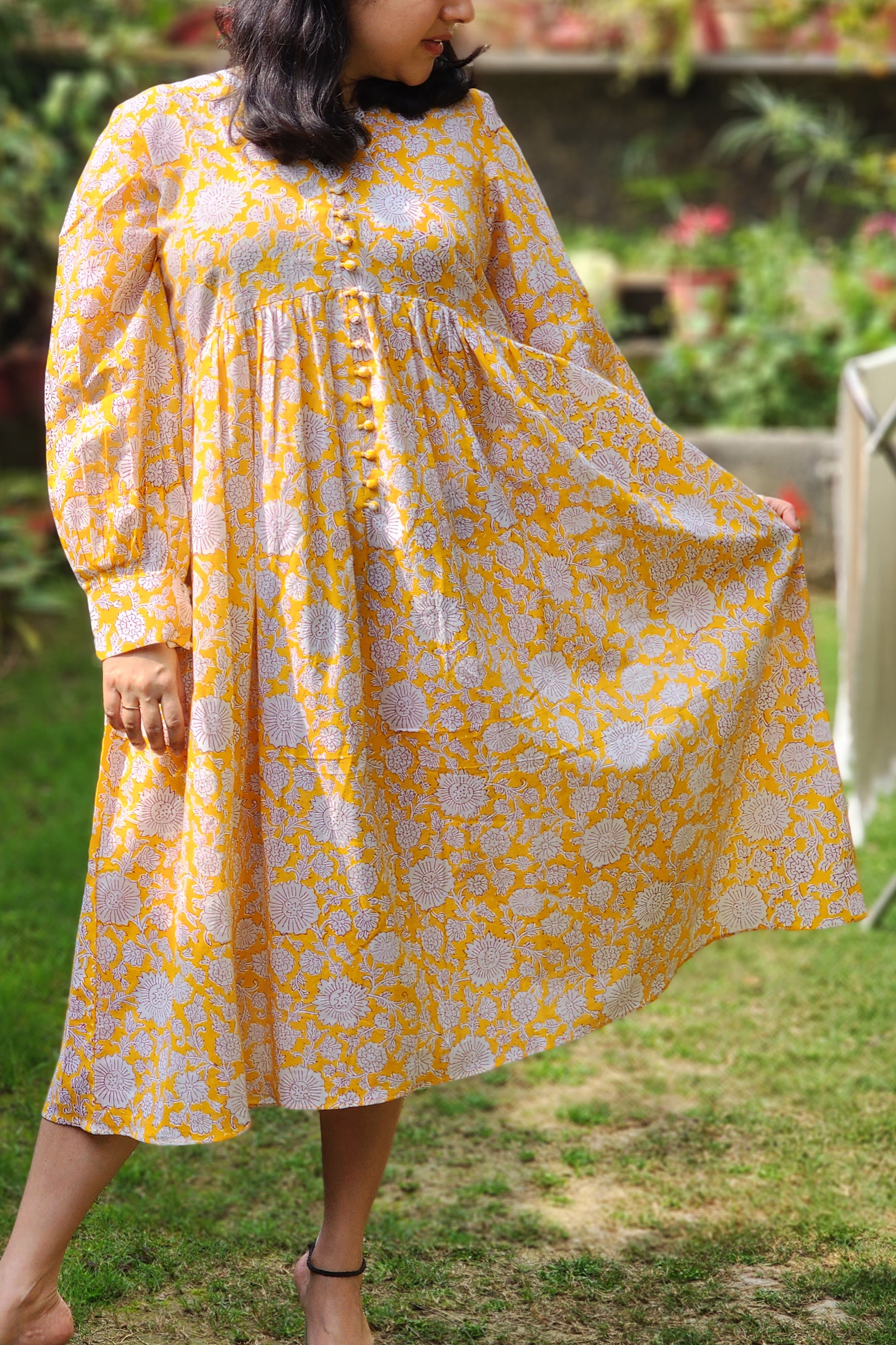 Introducing our Sunflower Bloom Summer Dress, a radiant and charming addition to your warm-weather wardrobe. Crafted with lightweight fabric and adorned with delicate floral motifs, this calf-length dress is designed to keep you cool and stylish on sunny days. The dress features a cheerful yellow hue accented by a white floral motif print, evoking the freshness of a blooming garden in full bloom.