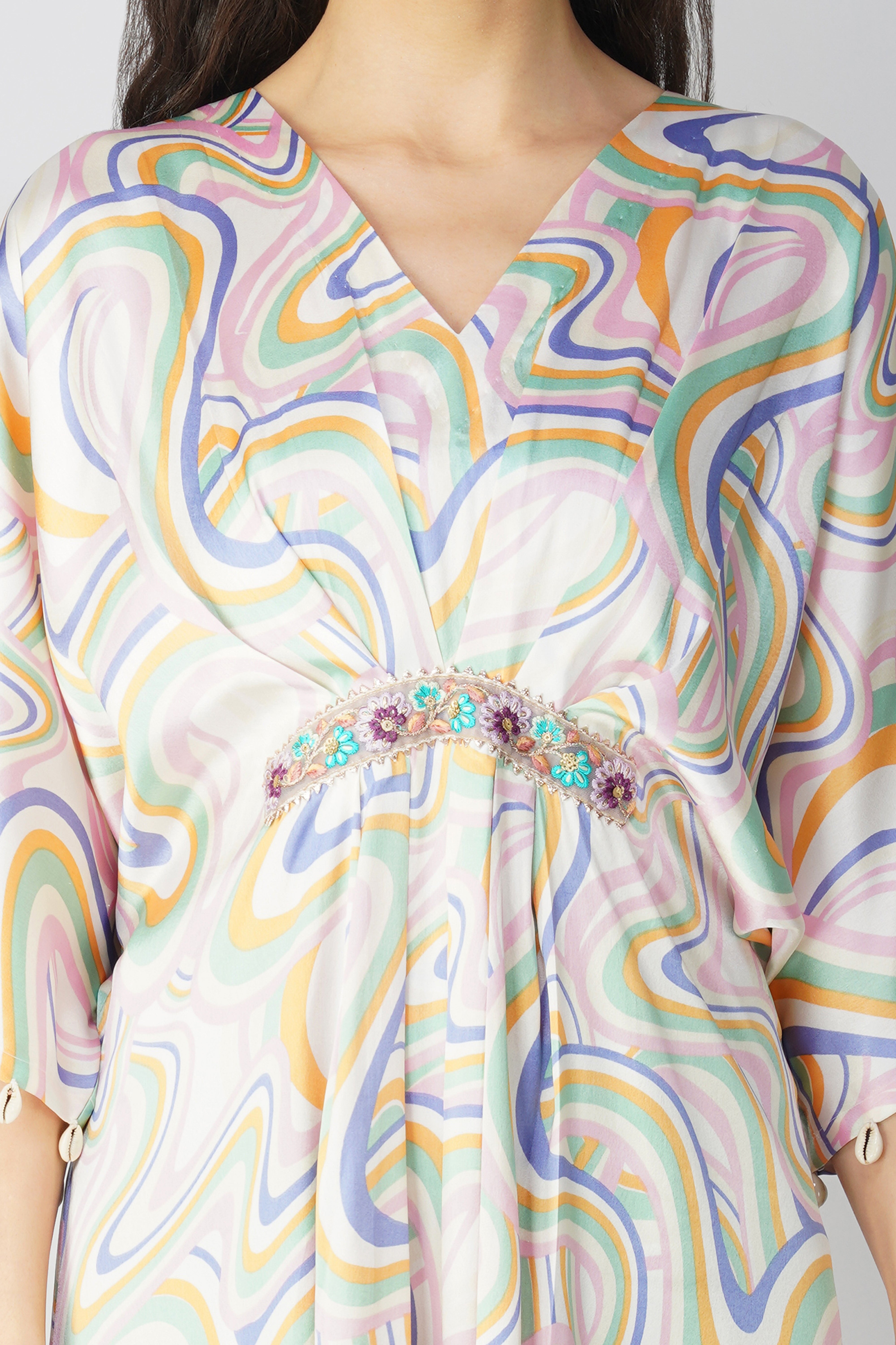 Designed with a size-inclusive mindset, the Sunlit Swirl Satin Kaftan Dress celebrates every body with its elasticated waist, ensuring a comfortable and flattering fit for all.