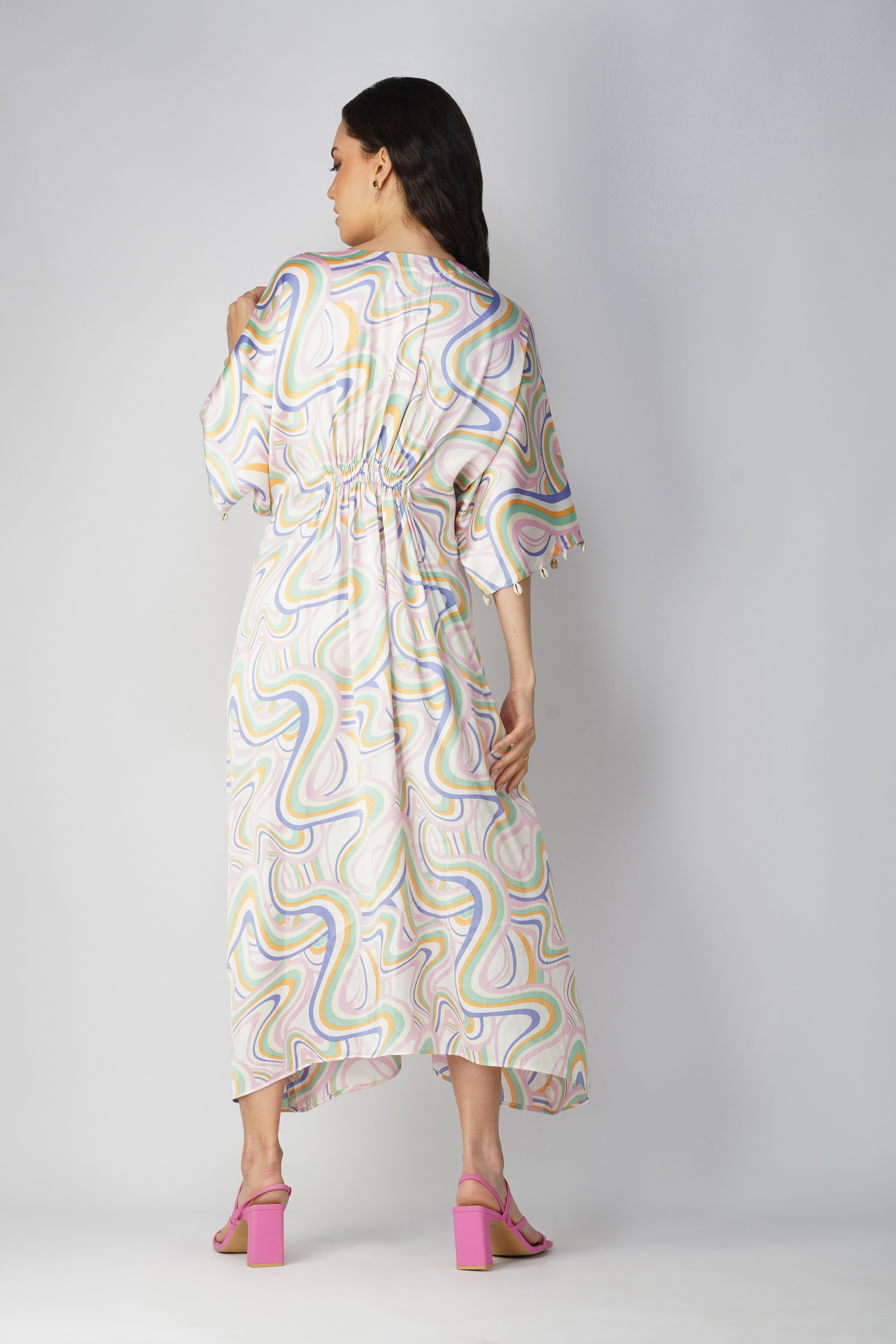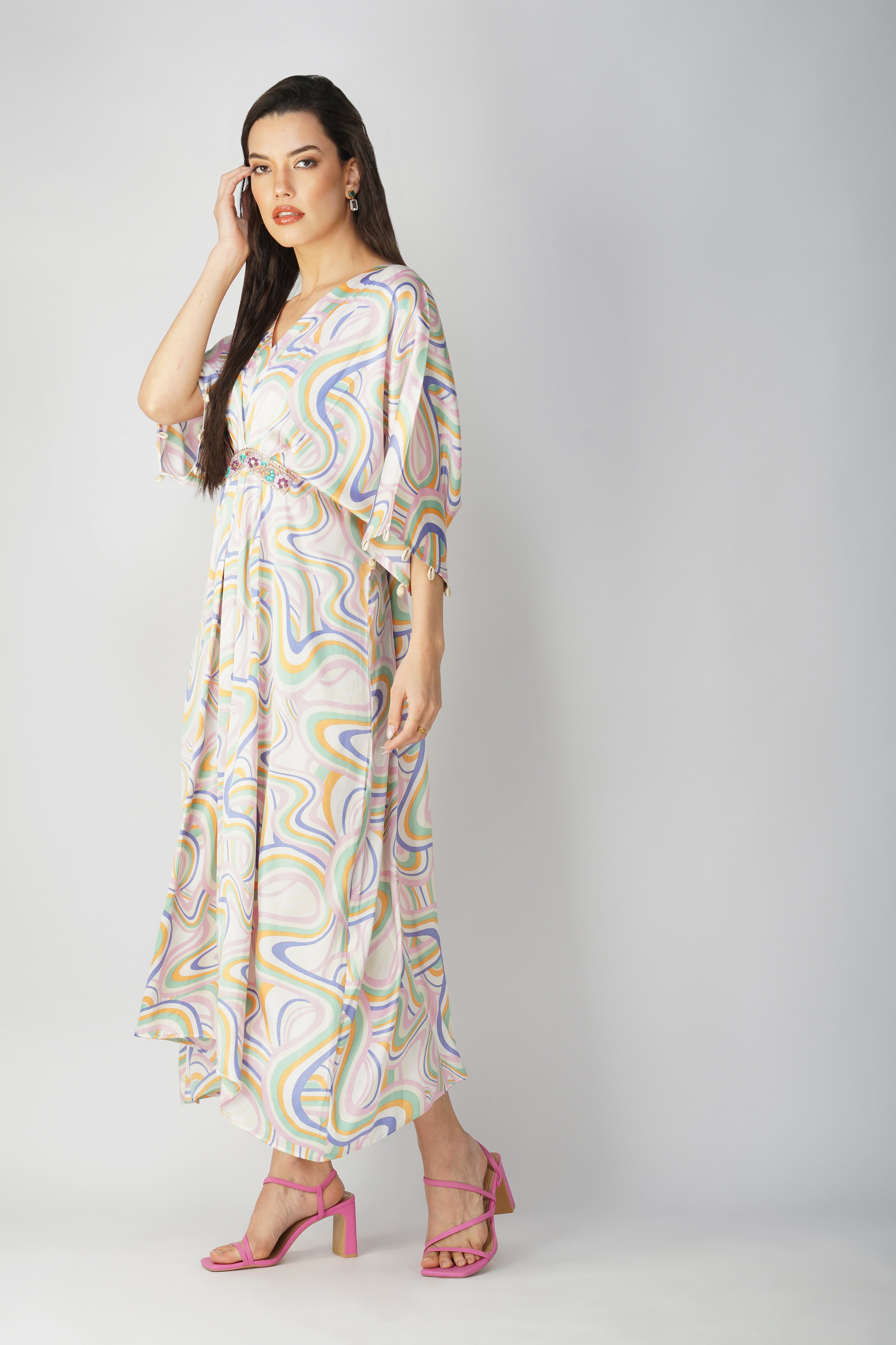 Embrace the essence of carefree elegance with our Sunlit Swirl Satin Kaftan Dress – a chic and versatile piece designed for your resort wear wardrobe. This calf-length dress boasts a playful swirl print, loose kimono sleeves, and thoughtful details that make it perfect for holiday escapades and summer brunch outings.