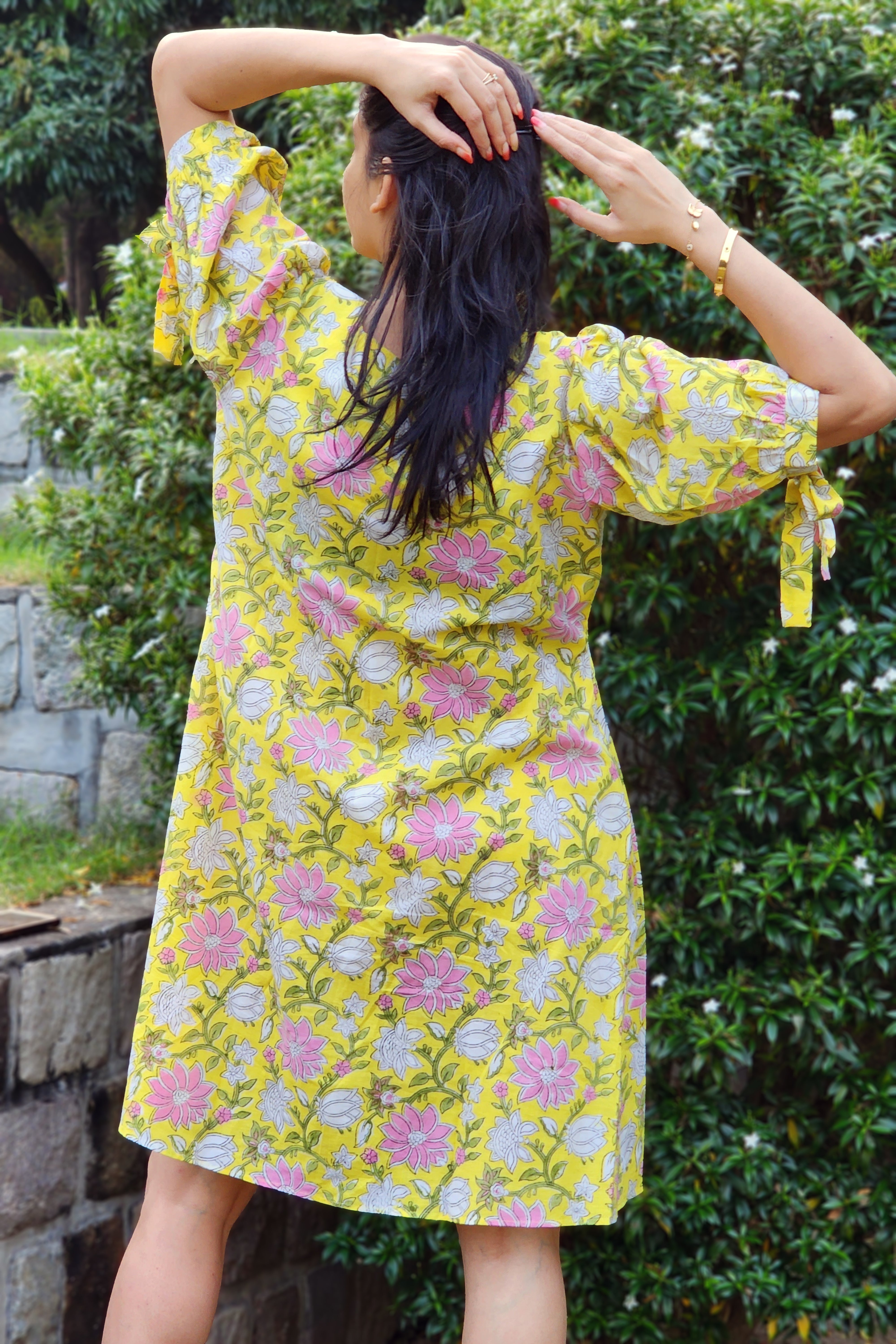 1. Floral Print: Adorned with a cheerful floral print in shades of yellow, this dress captures the beauty of blooming flowers in full bloom. Each petal and leaf bursts with colour, creating a lively and vibrant ensemble that's sure to turn heads wherever you go.