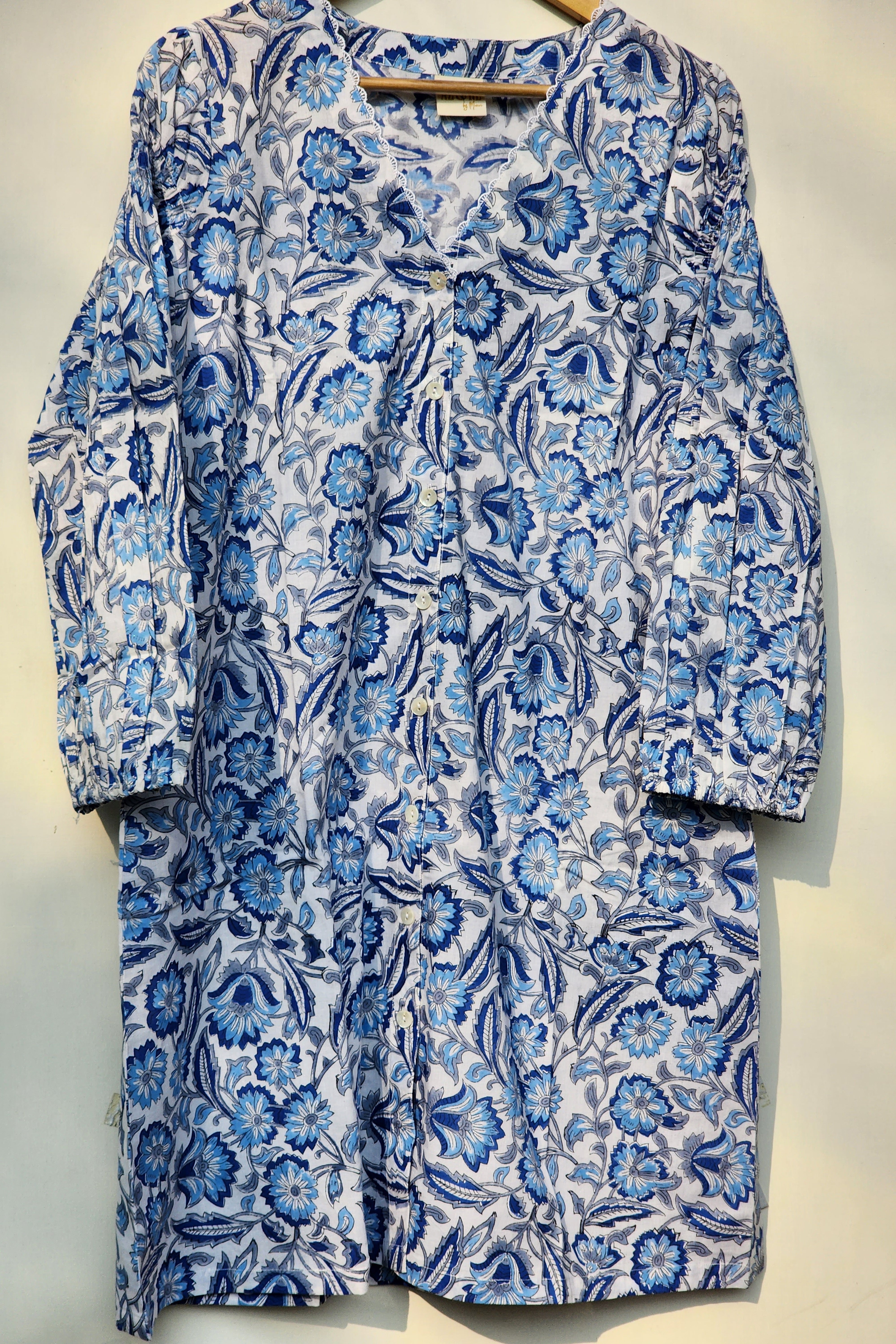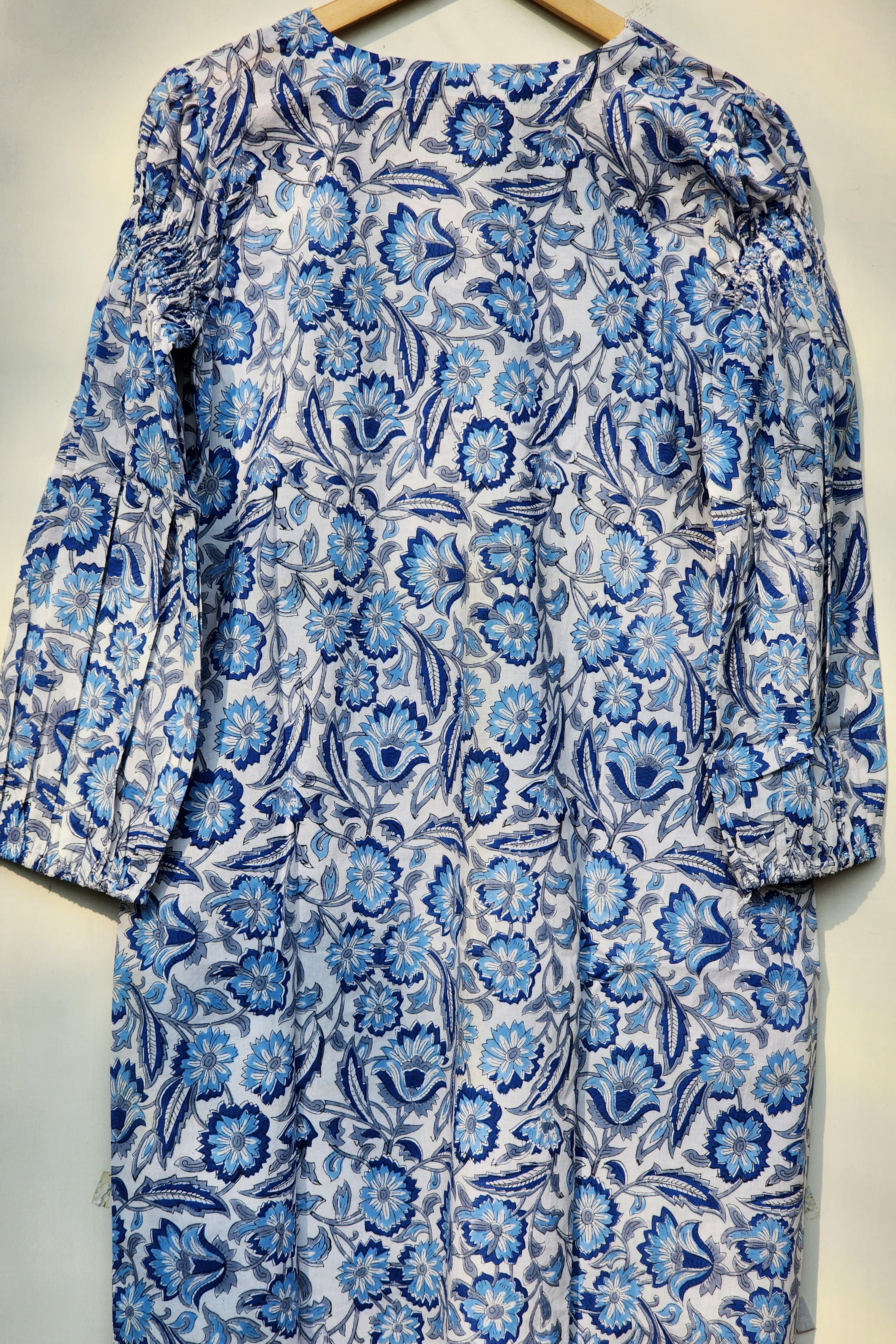 Blue Flowers on White Base: Adorned with delicate blue floral motifs on a pristine white base, this dress celebrates the beauty of nature in every detail. The floral patterns add a touch of freshness and vibrancy to the ensemble, evoking the tranquility of a sunlit garden.